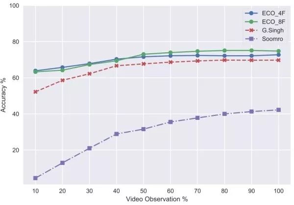在线视频分类问题通常以 early action recognition 的形式来评估。如上图所示,横轴显示的是可以看到的视频的前百分之几,纵轴则是对应的精度。基于上图的在 J-HMDB 数据集上的实验,可以看出 ECO 在精度上有明显的优势,并且只需要很小一部分视频就可以达到不错的精度。