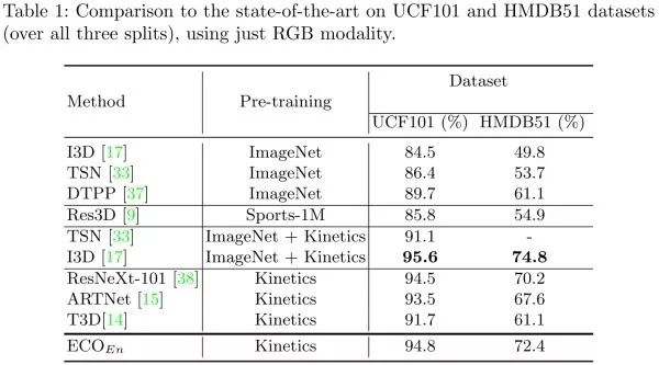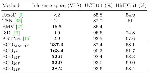 ECO 和 TSN 的不同点:TSN 中直接用 late-fusion 的方式对每个 segment 的结果做融合,而 ECO 中则是进行了 feature map 层面的融合(文中除了 3D 卷积,也采用了 2D 卷积)。此外 ECO 的速度要远快于 TSN。