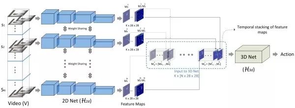 对于每个 segment,采用共享的 2D 卷积子网络 来得到 96 个 28*28 大小的 feature map,堆叠后得到一个 N*28*28*96 大小的特征 volume。此处