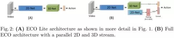 如上的两部分,就构建了这篇文章中构建的第一种网络结果 ECO-Lite。除了用 3D 卷积进行融合,还可以同时使用2D卷积,如下图所示,即为 ECO-Full 网络结构。此处多的一个 2D 网络分支采用的是 BN-Inception 网络中 inception-4a 到最后一个 pooling 层间的部分,最后再采用average-pooling得到video-level的表示,与3D net的结果 concat 后再得到最后的action分类结果。