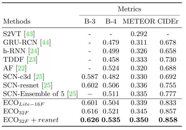 为了展现 ECO 可以被广泛应用于视频理解领域,作者还用 ECO 提取的特征在 video captioning 任务上做了实验(在 MSVD 数据集上)。将 SOTA 方法(即表中的 SCN)的特征换为 ECO,立马获得了非常显著的效果提升,这也表明了 ECO 的有效性。