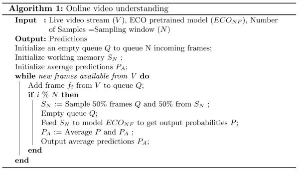 因此,作者基于 ECO 提出了以下的 online 处理框架。这个框架中主要维护了两个图像组,分别是存放较旧图像的工作记忆组和存放新的未处理图像的新收图像组。每次预测时,从两组视频中各采样一半来更新工作记忆组,并将其作为网络的输入得到当前的预测结果,将当前的预测结果和平均预测结果进行平均后得到最终的输出。这个框架在工作记忆组和平均输出两个层面保存了较长时程的信息,但同时依旧是以当前的图像为主。可以说是设计的很精巧的一个框架了。