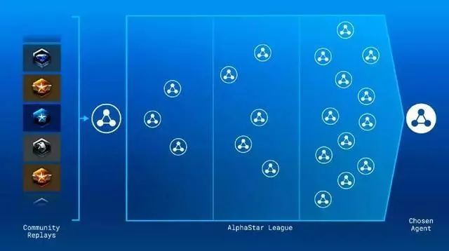 之后,团队会使用一个称为“Alpha League”的方法。在这个方法中,Alpha League 的第一个竞争对手就是从人类数据中训练出来的神经网络,然后进行一次又一次的迭代,产生新的 agent 和分支,用以壮大“Alpha League”。