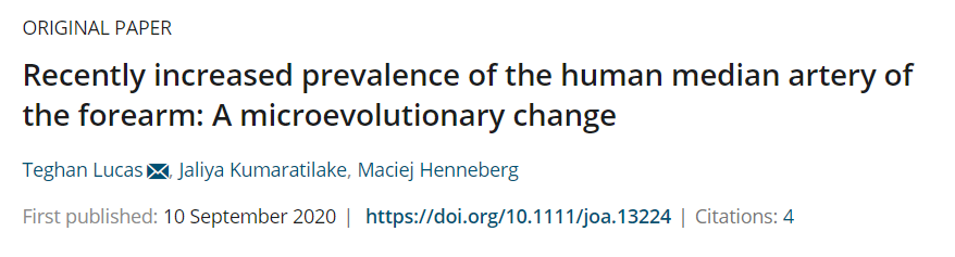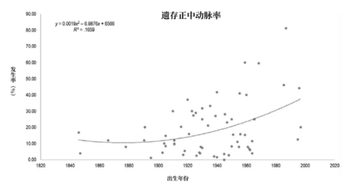 相较于一个世纪前,如今的人们有三倍的概率会拥有这条遗存的正中动脉。如果这种趋势继续下去,80 年后出生的人都将携带这条「额外」的动脉。