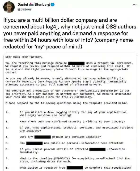 近日 cURL 创始人 Daniel Stenberg 收到一封来自《财富》美国 500 强企业的电子邮件,因为该公司(或其客户)可能正在使用 cURL ,所以他被要求回答是否 cURL 会受到 Log4Shell 漏洞影响以及如何处理的问题。随后他将邮件内容分享到网络上,并调侃称一家价值数十亿美元的公司,要求开源开发人员免费提供及时的答案,为何不去要求 OSS 作者?还回复称“要么付钱要么‘滚’”。