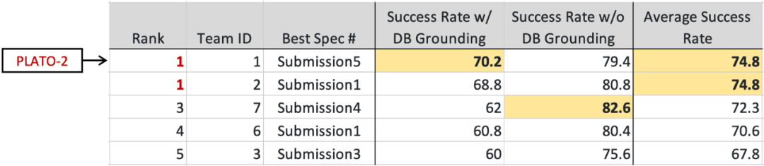子任务 1 评估中,考虑了宽松和严格 2 种场景下的任务成功率:对于宽松评估(Success Rate w/o DB Grounding),众包人员跟系统交互,然后标注任务是否成功,该过程中不会审核系统的回复是否跟数据库信息冲突;对于严格评估(Success Rate w/ DB Grounding),针对众包人员标注任务成功的对话,会进一步审核系统回复是否跟数据库信息匹配,只有 2 个条件都满足才算任务成功。宽松评估的区分度相对较弱,排名在前几位的方法差距较小;而严格评估则具有较强的区分度,且更能反映真实场景的性能,百度在该指标下排名第一,显著超越了其他系统。最终的榜单为宽松和严格评估的均值,百度和另外一个团队并列第一。
