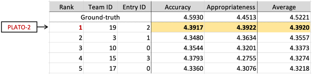 在子任务 1 中,系统需要针对给定的对话上文产出回复。在评估中,众包人员会从流畅性、相关性、准确度、参与度等 8 个方面对回复进行打分,并给出整体得分。榜单上,有 3 组模型的结果比较接近,最终并列头名,据悉前 2 组结果为百度提交的不同参数设置下的 PLATO-2 模型。因为 PLATO-2 已经开源,其他团队也有使用 PLATO-2 进行再训练提交结果。