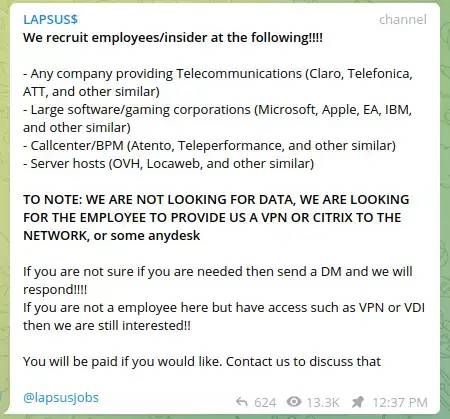 据称Lapsus$正在四处招揽大型科技企业的内线,让这些内部员工透露敏感信息。