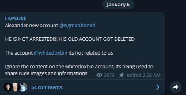 之后Lapsus$的社交网站频道辟谣,称SigmA没有被捕,如此证实了SigmA/Alexander Pavlov的确是Lapsus$首脑的推测。