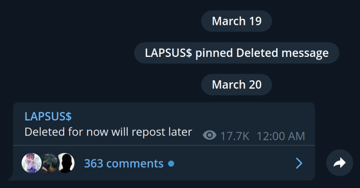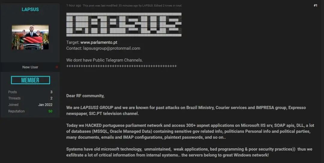 不知道是不是意识到了这一点,在发布截图后不久,Lapsus$就把帖子撤了下来。