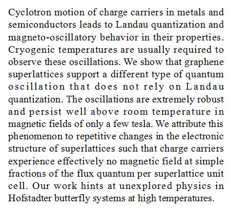 (导读 魏甜甜)金属和半导体中载流子的朗道量子化和磁振荡通常需要在低温下进行观察。本研究在石墨烯超晶格中展示了不依赖朗道量子化的一种量子振荡。这种振荡可以保持在温度高于室温且只有几个特斯拉的磁场中。研究人员把这种现象归因于超晶格电子结构的重复变化。研究结果暗示了高温下霍夫施塔特蝴蝶系统中未探索过的物理现象。