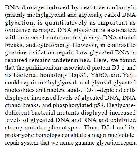 (导读 郭思瑶)活性羰基化合物引起的 DNA 损伤称为 DNA 糖基化,其修复机制尚不清楚。研究人员发现帕金森症相关蛋白质 DJ-1 和其细菌同源蛋白 Hsp31, YhbO 和 YajL 可以修复丙酮醛和乙二醛糖基化过的核酸,我们称之为鸟嘌呤糖基化修复。