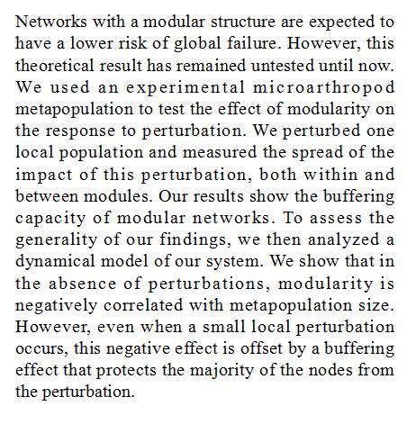 (导读 刘威尔)模块化网络是否具有更低的整体失效风险尚未证实。本文利用微型节肢动物的实验复合种群检验模块化对扰动响应的影响,发现了模块化网络的缓冲作用;动态模型分析显示, 缓冲作用能够抵消模块化对种群大小的负效应,保护大部分模块节点免于扰动影响。