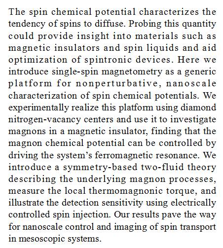(导读:阿金)自旋化学势可以描述自旋扩散的特征,而对它的深入了解可以帮助优化自旋元件。本研究引入单体自旋磁探测作为实验平台,利用金刚石中氮的空位缺陷研究磁绝缘体中的磁子,发现能够通过诱导系统的铁磁共振来控制磁子的化学势。这些实验结果为在介观体系内自旋输运的纳米尺度控制及其成像提供了实验基础。