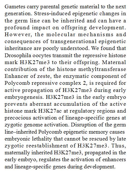 (导读 郭怿暄)父母的遗传和表观遗传信息均可以通过生殖细胞传递给下一代。本研究发现果蝇卵细胞中的 H3K27me3 可以通过母体提供的 zeste 基因增强子(Enhancer of zeste)和 PRC2(Polycomb repressive complex 2)在胚胎发育早期在合子中传递。破坏 PRC2 可造成一些基因增强子出现异常的 H3K27a c聚积,种系特异性基因提前激活,最终导致胚胎死亡。
