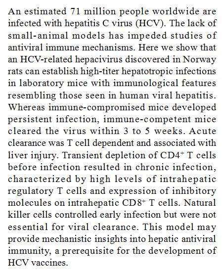 (导读 郭思瑶) 世界上约有 7100 万人感染丙肝病毒(HCV),但却缺乏有效地实验动物模型进行研究。研究人员通过利用在挪威鼠上发现的 HCV 相关病毒在实验小鼠上建立了高滴度肝脏感染,与人类肝炎感染的免疫特征类似。该模型有利于肝内抗病毒机制研究和乙肝病毒疫苗的研发。