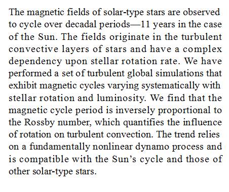 (导读 雷鸣)太阳磁场变化周期为 11 年,与其它类日恒星的磁周期并不相符。本研究运用非线性磁流体动力学模型展示了磁周期与星体自转和光度之间的复杂关系,结果表明,太阳及其它类日星体的磁周期都与罗斯比数成反比。这个结论调和了太阳与其它类日星体磁周期不一致的矛盾。