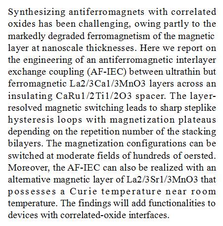 (导读:阿金)基于氧化物的合成反铁磁体的铁磁层在纳米级别厚度上会发生明显的磁性退化。本研究在超薄的磁性界面 La2/3Ca1/3MnO3 和绝缘 CaRu1/2Ti1/2O3 磁片之间发现了清晰的反铁磁层间交换耦合效应(AF-IEC),并观察到了磁层间的分层磁化翻转模式,导致其磁滞回线呈阶梯状。该发现有助于进一步开发相关氧化物电子学元件。