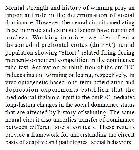 (导读 董堃)精神力量和过去的胜利经历对于社会地位的确立有着至关重要的影响,然而其背后的神经回路机制还尚不清楚。本研究使用光遗传手段,通过定向增强内侧前额叶脑区的突触(大脑细胞之间连接、通讯的基本结构单元)强度,使得处于劣势的小鼠勇气倍增,成功将原先占有优势的小鼠挤出玻璃管外。同时研究还表明,若要使弱势小鼠占上风需要给以更高强度的刺激。这些结果为更好地理解复杂的竞争关系和社会地位带来曙光。