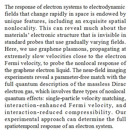 (导读 陈烈裕)电子系统对快速变化电磁场的响应具有独特的空间非局域性,本研究利用石墨烯的等离子激元对石墨烯电子流体的这种非局域性进行探究。石墨烯等离子激元的近场成像实验展示了无质量狄拉克电子气体对全量子描述的无参数匹配,其中涉及三种非局域量子效应。该实验方法可以确定电子系统的全时空响应。