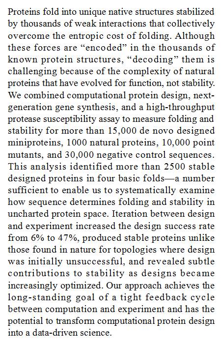 (导读 严冰)本研究结合计算机辅助蛋白质设计、下一代基因合成,以及高通量蛋白酶敏感性检测技术,对 15000 种人工设计小蛋白质、1000 种天然蛋白质、10000 个点突变蛋白质和 30000 个阴性对照序列的蛋白质折叠及稳定性进行了检测。该结果揭示了高稳定性蛋白质的特点,并使蛋白质设计成功率从 6% 提高到了 47%,将计算机辅助蛋白质设计带入了数据驱动的新阶段。