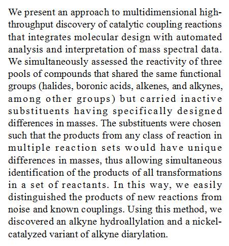 (导读 卓思琪)本文展现了一种整合分子设计、自动化分析以及质谱数据解析的多维高通量筛选技术,用于发现催化偶联反应。通过对反应集非活性基团的设计,该系统可以通过反应前后化合物质量上的差异同时鉴别一个反应集中的所有转化产物,从而使研究者能简单地从众多已知偶联中区分出新反应的产物。