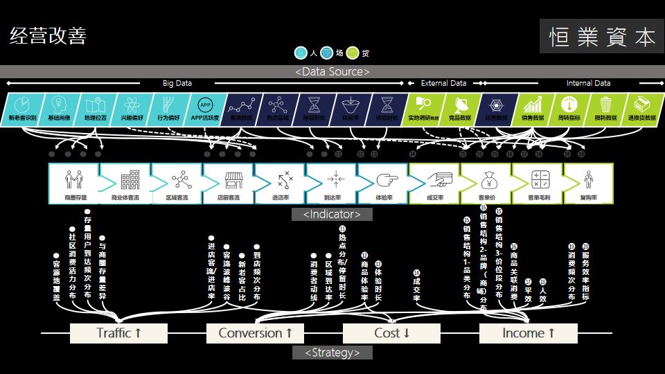 具体到经营改善环节,首先就是你怎么定性和定义,把那个轻的标准化服务直接抽离出来,然后去给你的B赋能。比如在线下Mall和品牌商中,商圈存量、商业客流、区域客流、进店率、到达率、体验率、成交率、客单价、客单毛利、复购率,这些直接全维去做提升,每个都有直接相对的大概三到五个标签的指标。这些只有对行业经验有积累10年以上才能做的到,才能打通,所以自然就形成了时间壁垒和进入的成本壁垒。