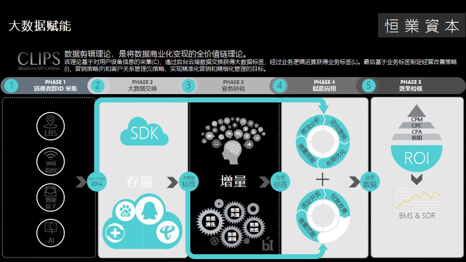 具体来讲,价值链全埋点效果需要量化,那么我们大数据赋能到底是怎么来做的?这就需要我们大数据赋能数据剪辑理论。消费者的数据采集、大数据交换、业务转化,从数据标签到业务标签,通过赋能应用,客流分析、挖掘、布局优化等等,然后到ROI,这个中间有三个点:就是存量、增量和质量。这是大数据的技术应用,几乎可以直接全链路进行数据采集了,他们现在做得效果还是比较好的,所以我觉得产业互联网成功机会还是非常大的。