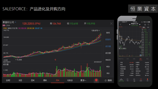 从产品演进的角度来看,产品演进包括Sales Cloud、Servcie Cloud、Data Cloud、Collaboartion cloud(含Chatter)、Cuntom Cloud;平台演进包括Salesforce.com 、Force.com 、Heroku、ExactTarget、Work.com、DATA.com,也就是包含了SFA-协同-销售-PAAS-服务-商务等产业场景;在战略及并购方向上,包括了大数据商业应用、数字化营销、社会化协作等三个部分,细分为:Sales Tech(销售技术):CRM,Retail Tech(零售技术):电子商务,有赞、微盟,Ad Tech(广告技术):信息流,头条、百度,Mar Tech(营销技术):消费者全维数据,Consulting。