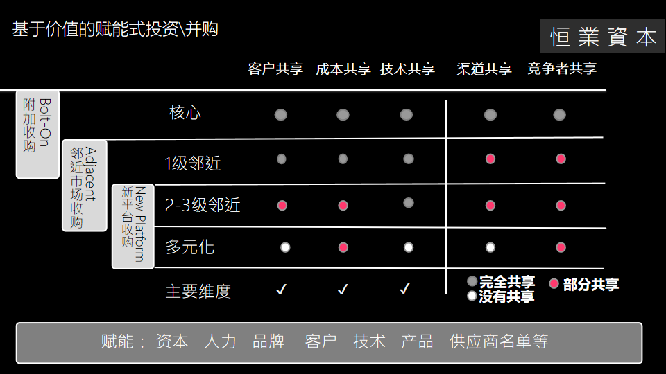 第二个是,优化效率的产业协同>单点的舍九取一。整合型平台方能够从线上线下同步强化产业集中程度,提升产业链整体效率;通过客户共享、技术共享、渠道共享、竞争者共享、从而改变产品或服务的成本结构,形成资本、人力、品牌、客户、技术、产品、供应商名单等多维度的产业赋能或协同。
