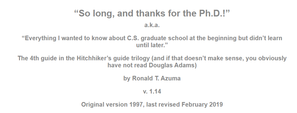 Ronald T. Azuma博士于1995年5月在北卡罗莱纳大学取得计算机科学的博士学位,后来他在1997年发表了一篇名为「这么久了,感谢博士学位」的文章,又名「刚开始我想知道有关CS的一切,但直到毕业后我都没搞懂」。
