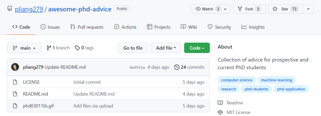 最近卡内基梅隆大学的一位博士生建立了一个GitHub仓库,收集了上百个大咖对博士生涯的研究建议,从准博士需要的读书计划、访问日、选择学校,从博士生存指南、如何读论文、写论文、写Review等等应有尽有。