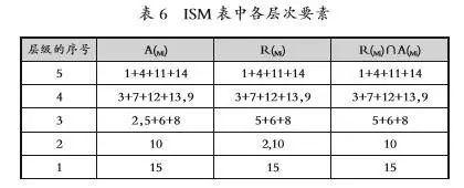 为将可达矩阵通过变换作出层级有向图,需要定义两个集合,可达集合R(Mi)和先行集合A(Mi)。R(Mi)表示Mi可以到达的集合,由可达矩阵Mi中所有元素为l的列标组成;先行集A(Mi)表示可以到达Mi的前因集,由可达矩阵中Mi列的所有元素为l的行标组成。根据R(Mi)=R(Mi)∩ A(Mi)确定最高层元素Mi,同时,在可达矩阵中剔除所有最高层因素所在的行和列,再在余下的可达矩阵中采用相同方式,找到新矩阵中的最高层元素(第4层要素),循环迭代,直到找出表6所示各层要素集。