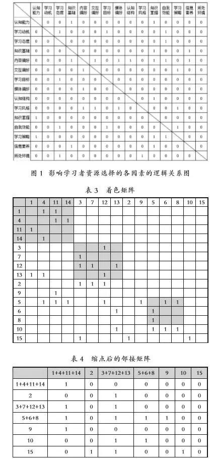 根据ISM方法,将15个因素分别在行和列上排序,因素之间的关系用0和1表示,当横坐标的因素对纵坐标的因素有直接影响时,所在的单元格用1表示,否则用0表示。比如,第一行中,学习者的认知能力直接影响其知识基础,因此,相应的位置取值为1。我们在查阅大量文献的基础上,对15个因素之间的相互关系进行了反复查证,同时又与5位研究生反复讨论,最后确定如图1所示的影响学习者资源选择的因素间的逻辑关系图。