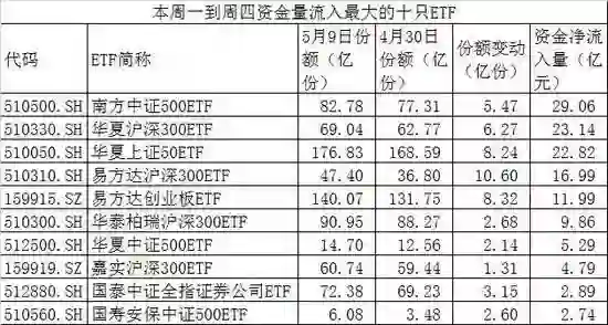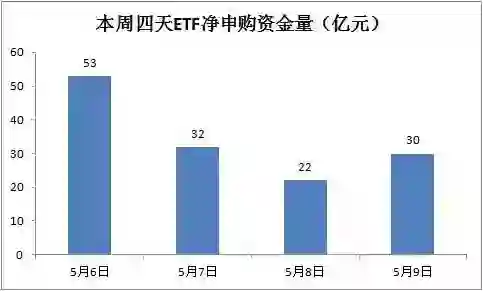 而这几天,市场波动中,大资金风向标之一的ETF(交易型开放式指数基金)获得近140亿元资金流入。本周4个交易日,5月6日-5月9日ETF分别有53亿元、32亿元、22亿元、30亿元,合计净流入137亿元。
