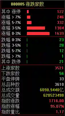 个股方面,其中超百股涨停,上涨的个股高达3521家,仅21家跌停。而A股总市值今天暴增了1.74万亿。
