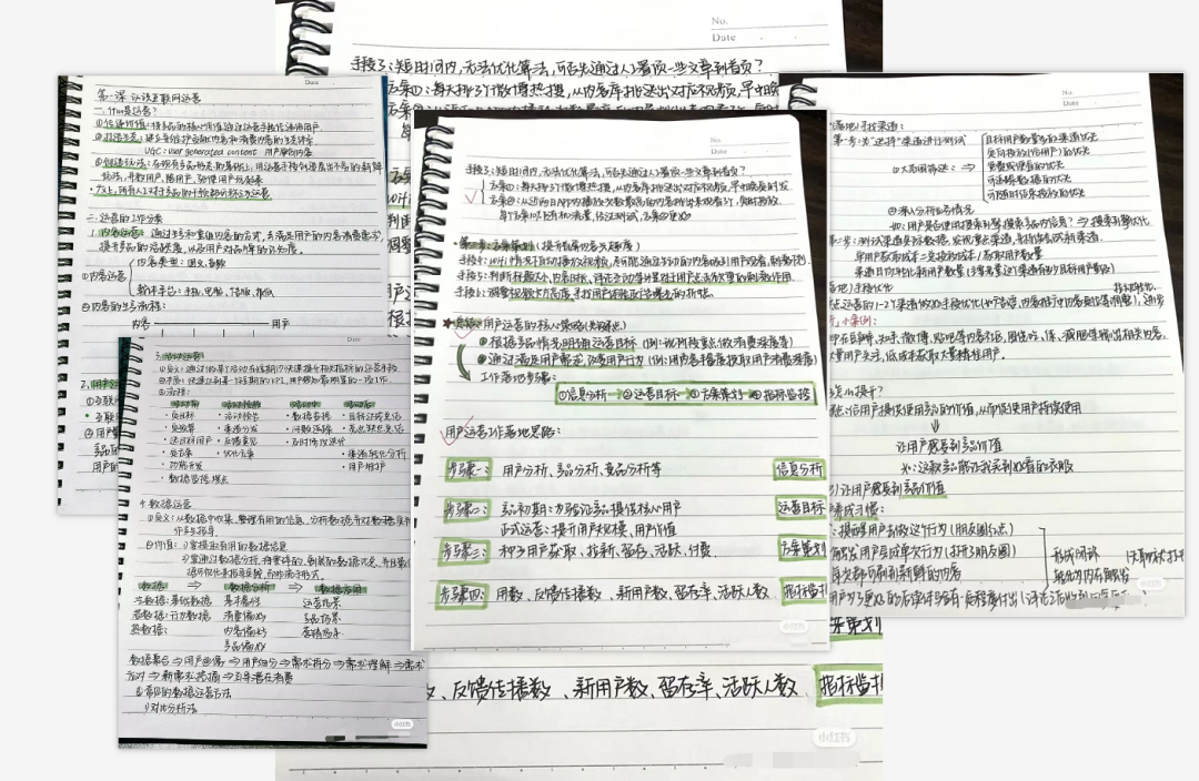 这是我利用每个周末的时间集中学习,记的学习笔记,密密麻麻全是干货,而且重点部分还用颜色进行了区分。