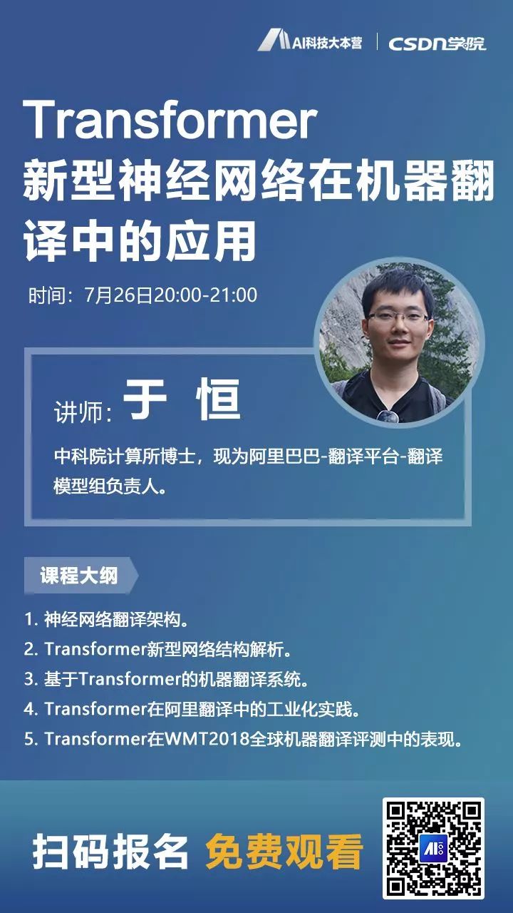 本期公开课,AI科技大本营邀请到了阿里巴巴翻译平台的翻译模型组负责人——于恒,为大家详细讲解 Transformer 的新型神经网络以及在机器翻译领域中的应用。另外,他还将从工业实践和评测竞赛的角度更全面的展现实用价值,希望大家有所收获。