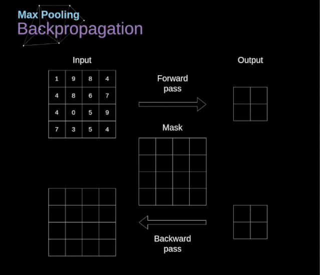 在本文中,我们将只讨论最大值池化的反向传播,但是我们将学习的规则只需要稍加调整就可以适用于所有类型的池化层。由于在这种类型的层中,我们没有任何必须更新的参数,所以我们的任务只是适当地分布梯度。正如我们所记得的,在最大值池化的正向传播中,我们从每个区域中选择最大值,并将它们传输到下一层。