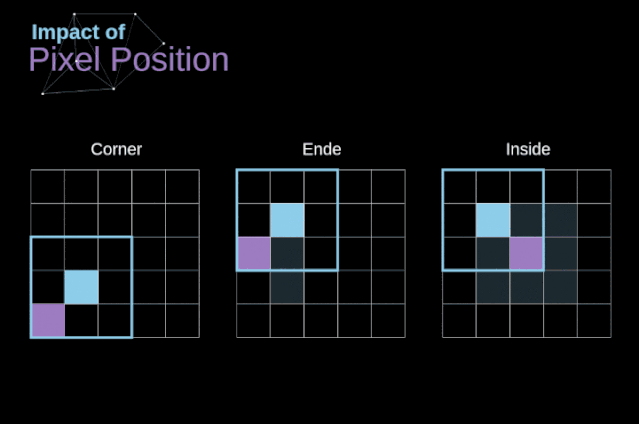 更重要的是,如果我们观察卷积核如何在图像中移动,我们会发现位于图像边缘的像素的影响要比位于图像中心的像素小得多。这样我们就丢失了图片中包含的一些信息。通过下图,您可以知道像素的位置如何改变其对特征图的影响。
