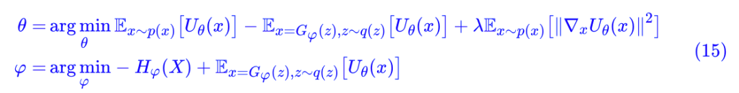 所以我们发现,整个过程实际上就是 (14) 和 (13) 的交替梯度下降。而正如第一篇所说的,θ 的这个目标可能带来数值不稳定性,基于第一篇所说的理由,真样本应该在极小值点附近,所以我们可以把梯度惩罚项补充进 (14),得到最终的流程是: