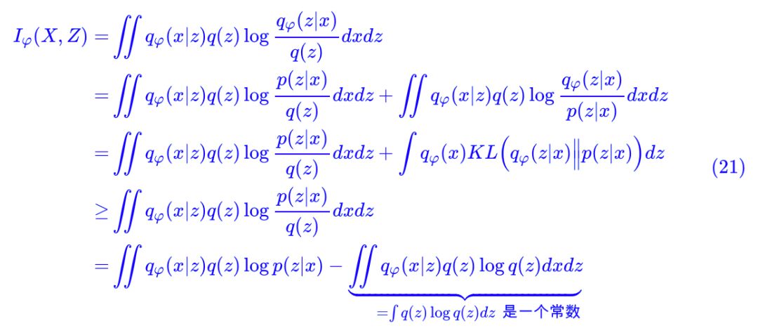 如果我们处理的是离散型分布,那么因为 x=Gφ(z) 是确定性的,所以 qφ(x|z)≡1,那么 Hφ(X|Z) 为 0,即 Iφ(X,Z)=Hφ(X)。
