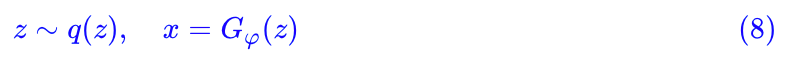 这里的 q(z) 代表着标准正态分布。也就是说,我们可以从标准正态分布中采样出一个 z 出来,然后通过固定的模型 Gφ 变换为我们想要的 x。这意味着这种分布的理论表达式是: