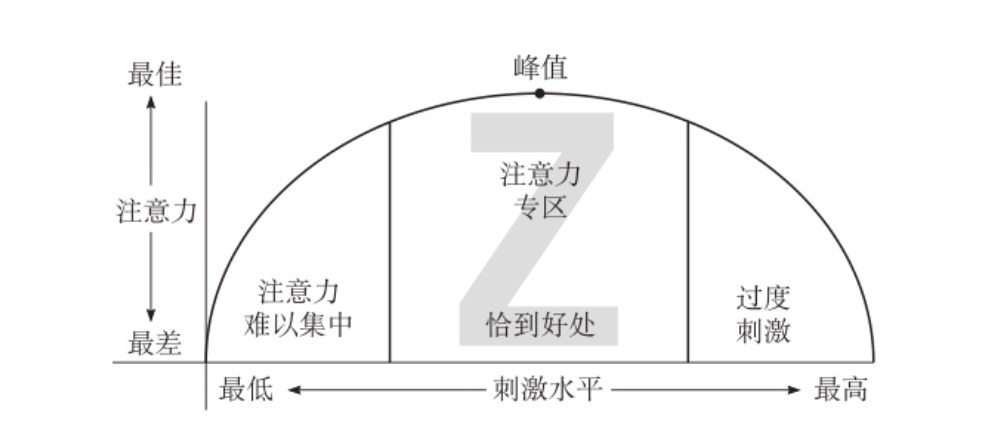 注意力曲线意味着随着刺激水平的升高,注意力水平也会逐步升高,达到峰值之后,就开始逐渐下降;在注意力曲线的中心区,受到的刺激程度恰到好处,这时注意力是处在最佳状态的,工作效率也是最高的,这块中心区域就叫注意力专区。