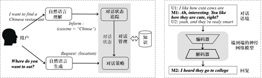 当前对话系统可以总结为以下两种类型,第一种是任务导向型的对话系统(Task-Oriented Dialog System),它通常以帮助用户完成具体的任务为目的,如手机助理、客服机器人,订票机器人等;第二种是开放域的对话系统(Open-Domain Dialog System),它经常会在一个开放的区域里和用户聊天,并且利用各种谈话技巧来增加他们的互动,例如提供娱乐、给出建议、讨论有趣的话题、提供情感安慰等。