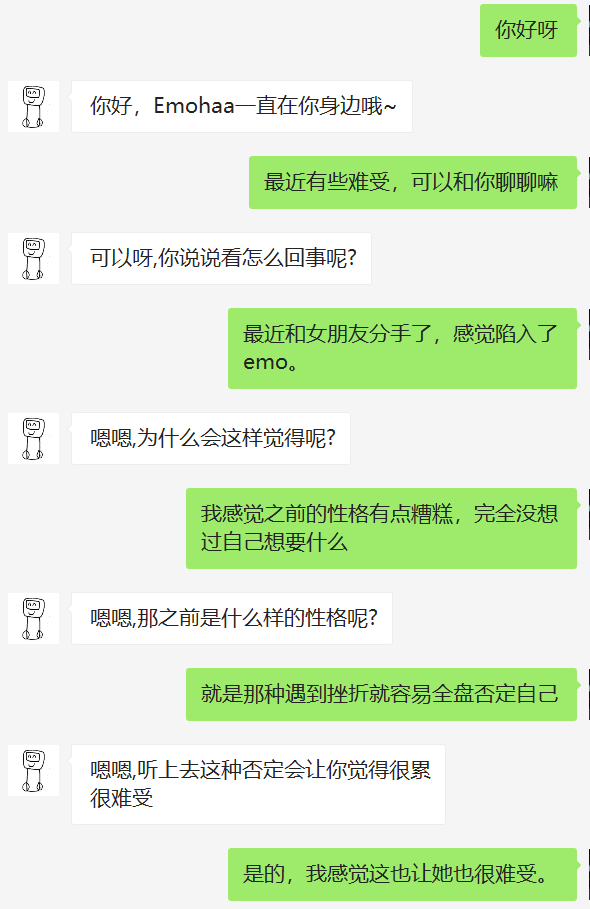 首先是关于语义的认识。语意理解是人类进行会话活动的基础和核心,是对话活动的先决条件。它要求系统能够理解对话、理解用户,甚至关联对话之外的背景信息。在早期的测试阶段,当用户问Emohaa“你为什么叫Emohaa”,Emohaa却仍然回复“我叫Emohaa”,意义就差得非常远。
