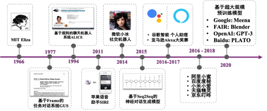 2011年,苹果推出的语音助手 Siri也使得智能助理在工业界引起了广泛关注。微软于2014年发布了首个社会机器人——微软"小冰",它能够提供一个开放式的领域聊天功能。2020年,在大数据、大算力的支持下,大量大型预训模型陆续推出,它们不仅可以回答用户的问题,还能以有趣的方式进行各种话题讨论。这些预训练模型将对话系统的研究推向了一个新的高度,在开放领域的会话能力方面有了新的突破。