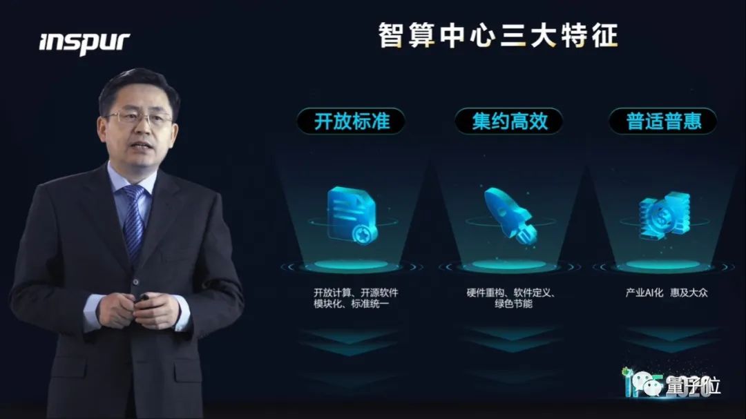 浪潮认为,智算中心将成为新基建,为AI产业提供动力,它需要满足开放标准、集约高效和普适普惠三个必要条件。