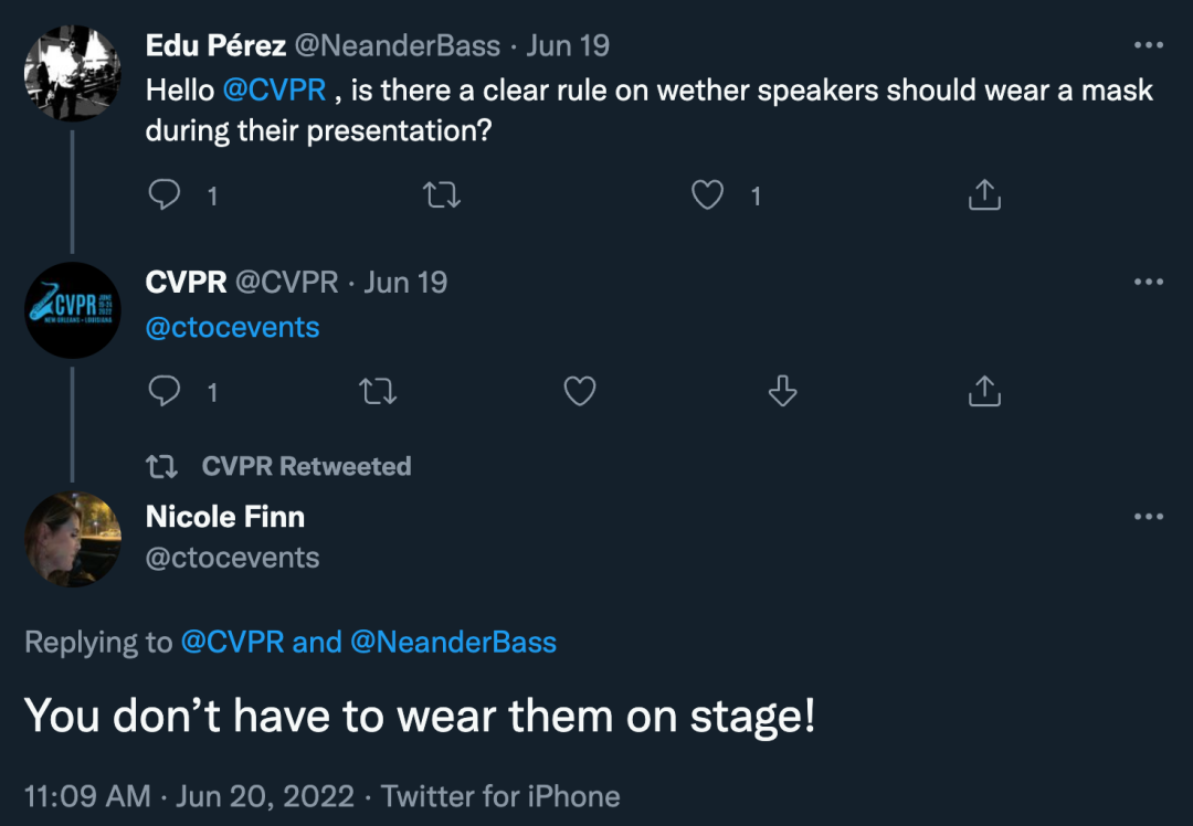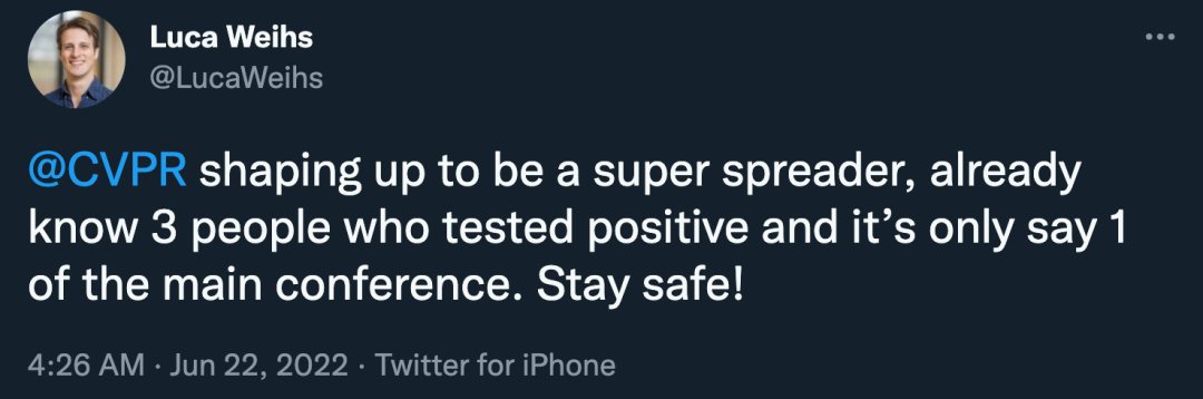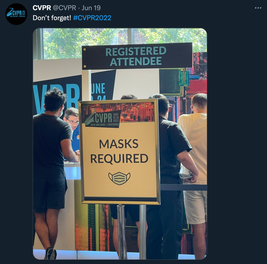 主会议开幕第二天,就有参会者陆续检测出阳性。尽管CVPR也强调了参会需佩戴口罩,但这条规定多少是「形同虚设」了。从现场照片来看,一部分人坚持佩戴口罩,但更多的人在用餐、演讲等环节均未佩戴口罩。