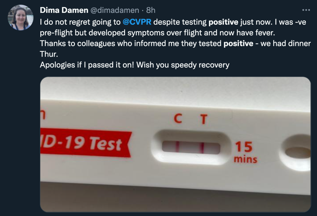 据英国布里斯托大学计算机视觉教授Dima Damen自述,她在回程的航班上出现了新冠症状,现在有一些发热。感染原因可能是上周四的一场晚餐。
